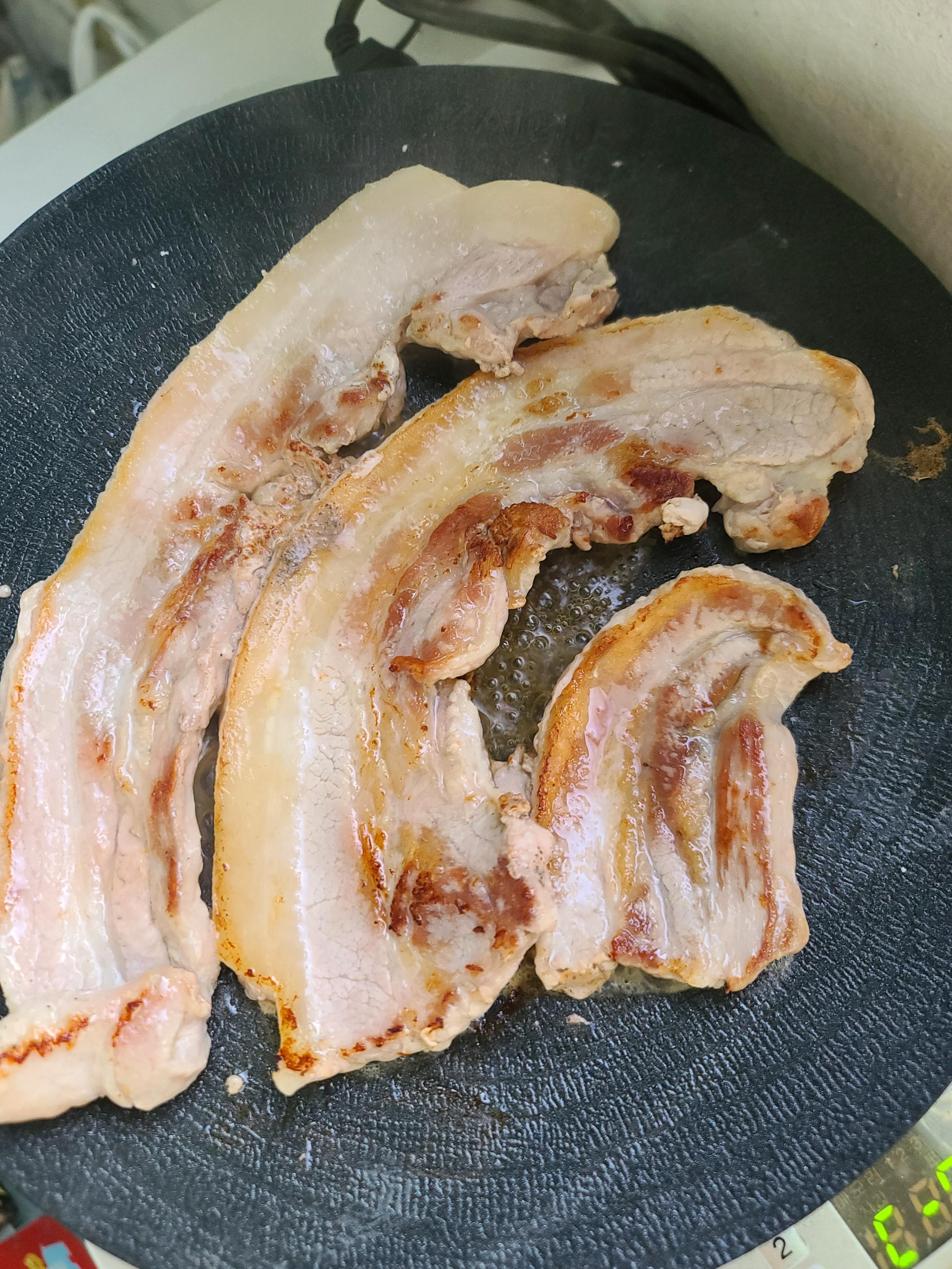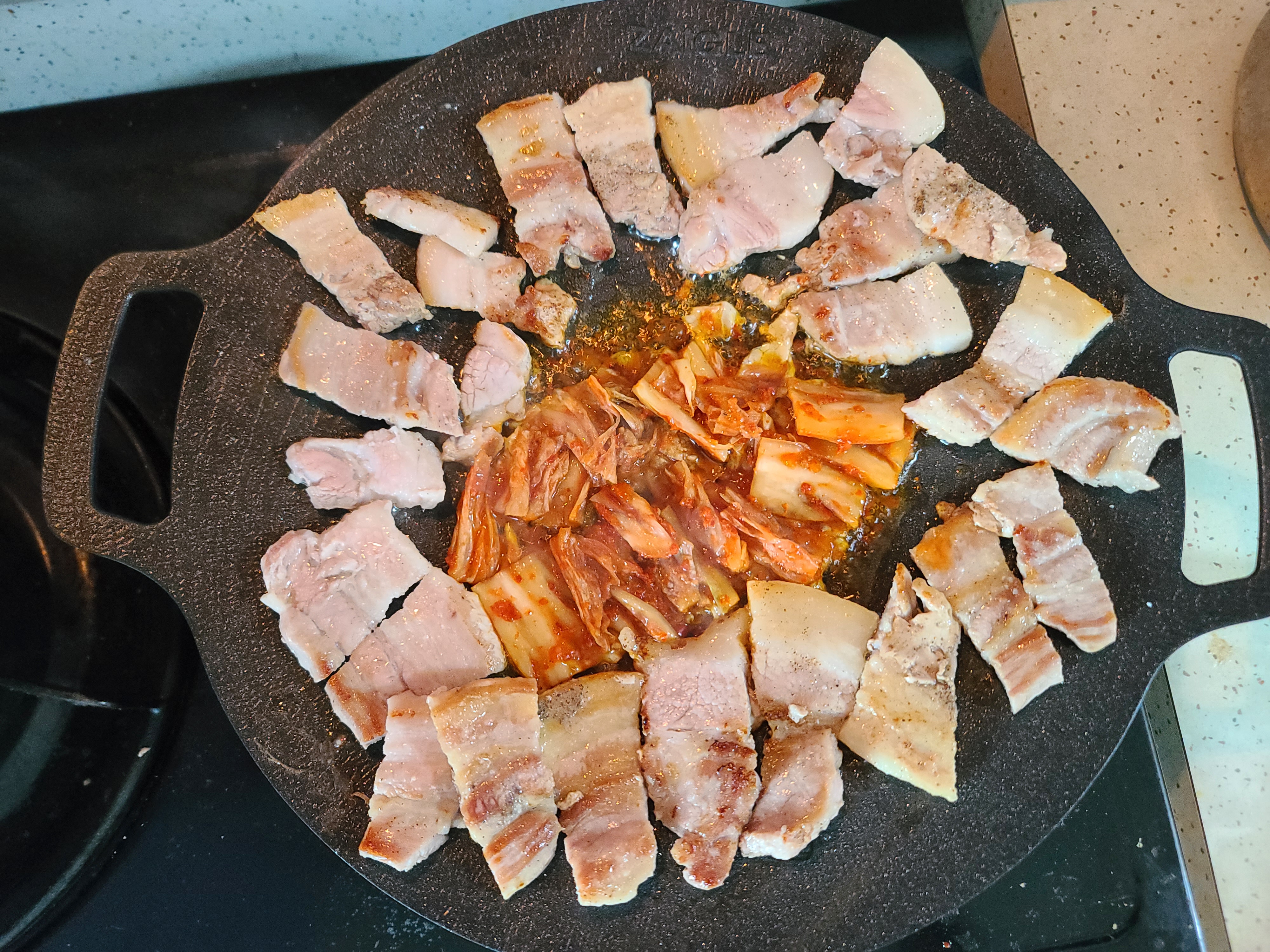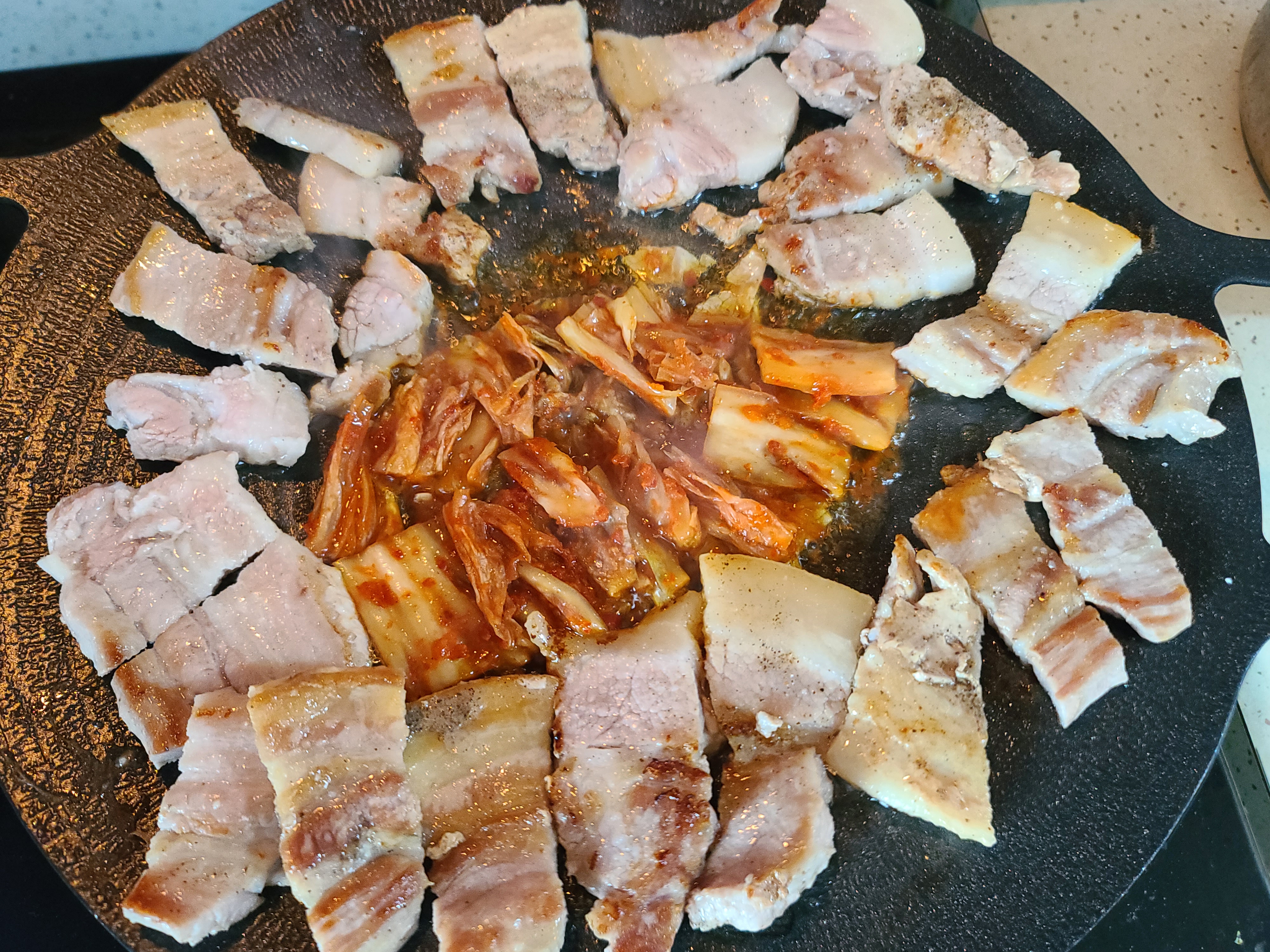 기름도 많이 튀지않고 고기기름에 굽다니 김치는 저거보다 두배나 세배로 더 구워야겠어요 아 마늘도!