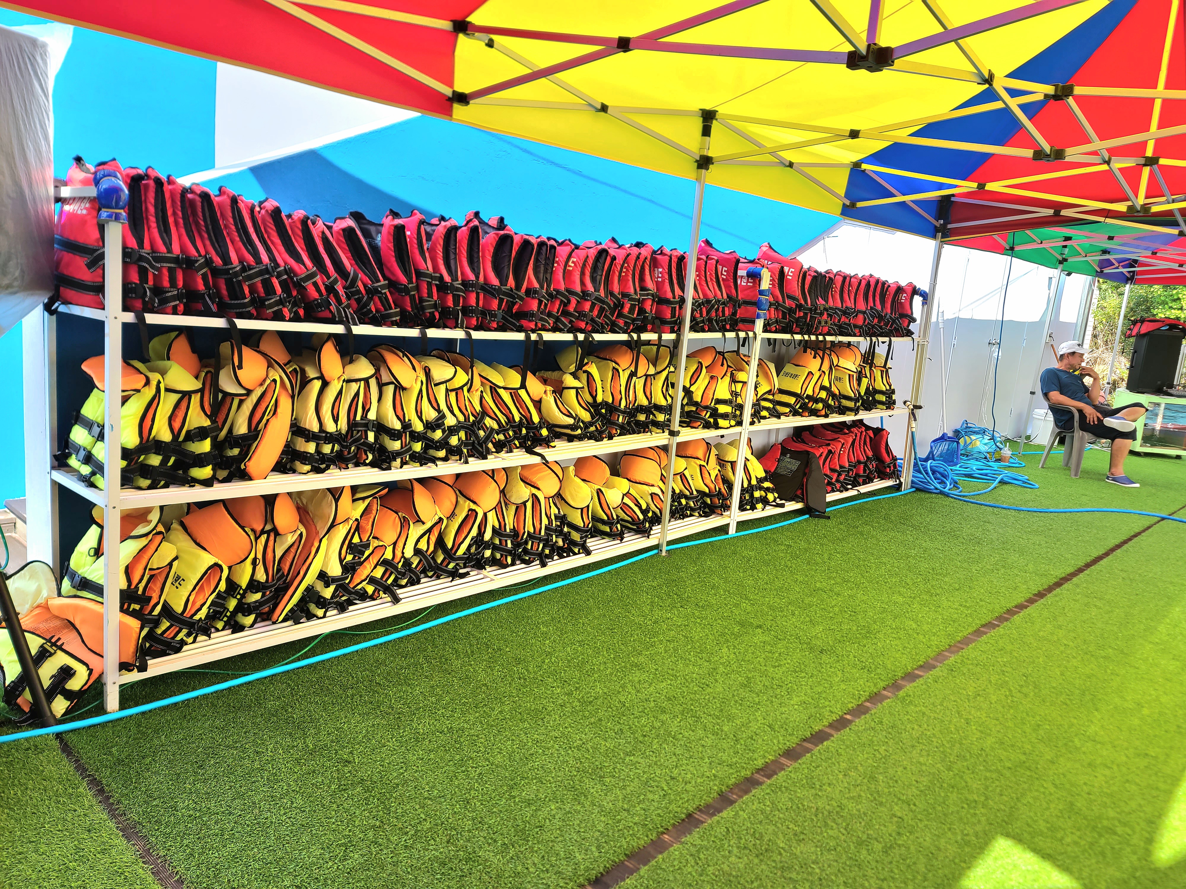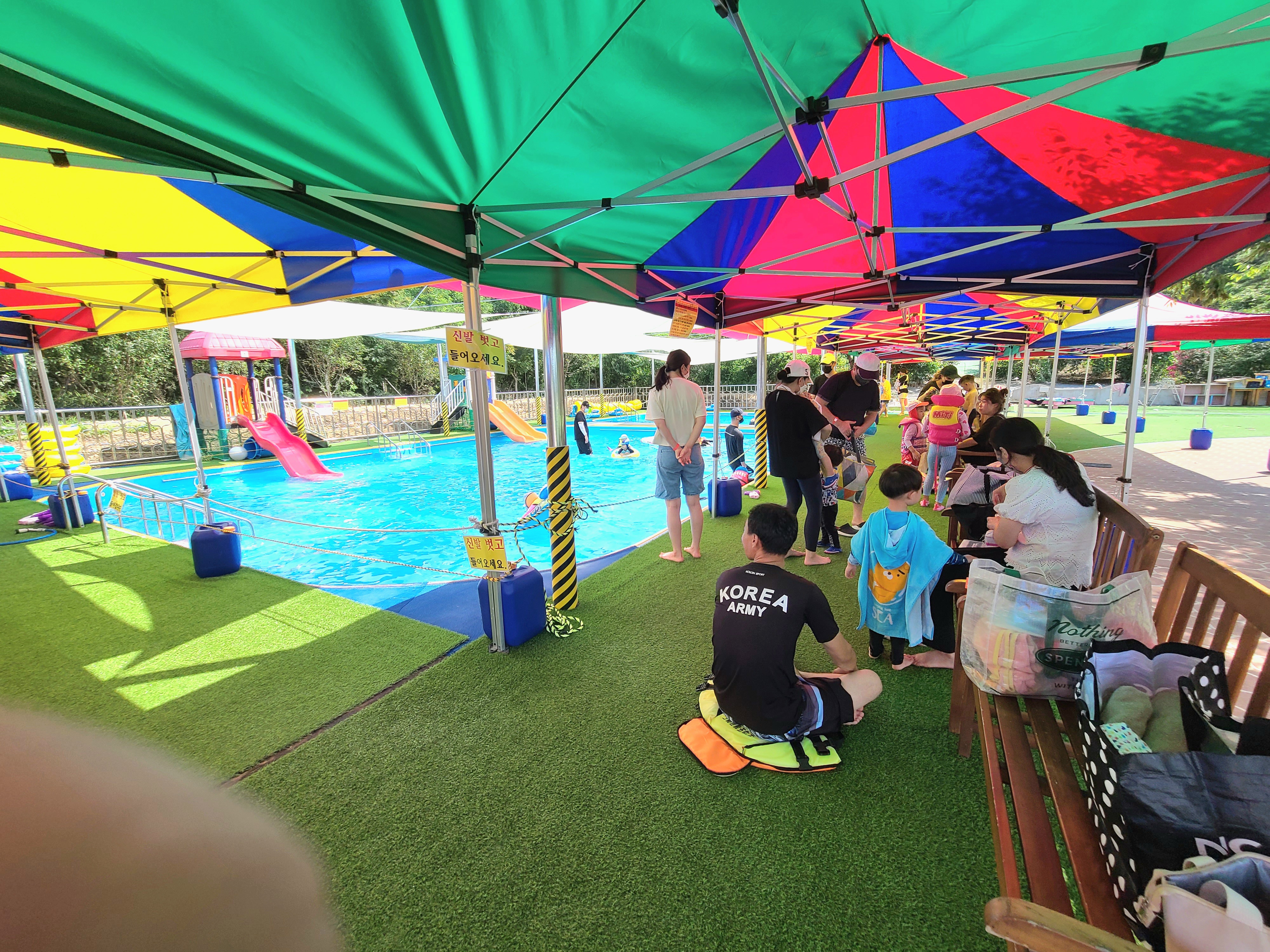 어른들 대기하는곳은 천막있고 길게 의자들놓여있어요 짐들놔두거나 풀장이 한눈에 보이고 보호자 한분이 들어가면 한분은 대기하시는 분도 많더라고요