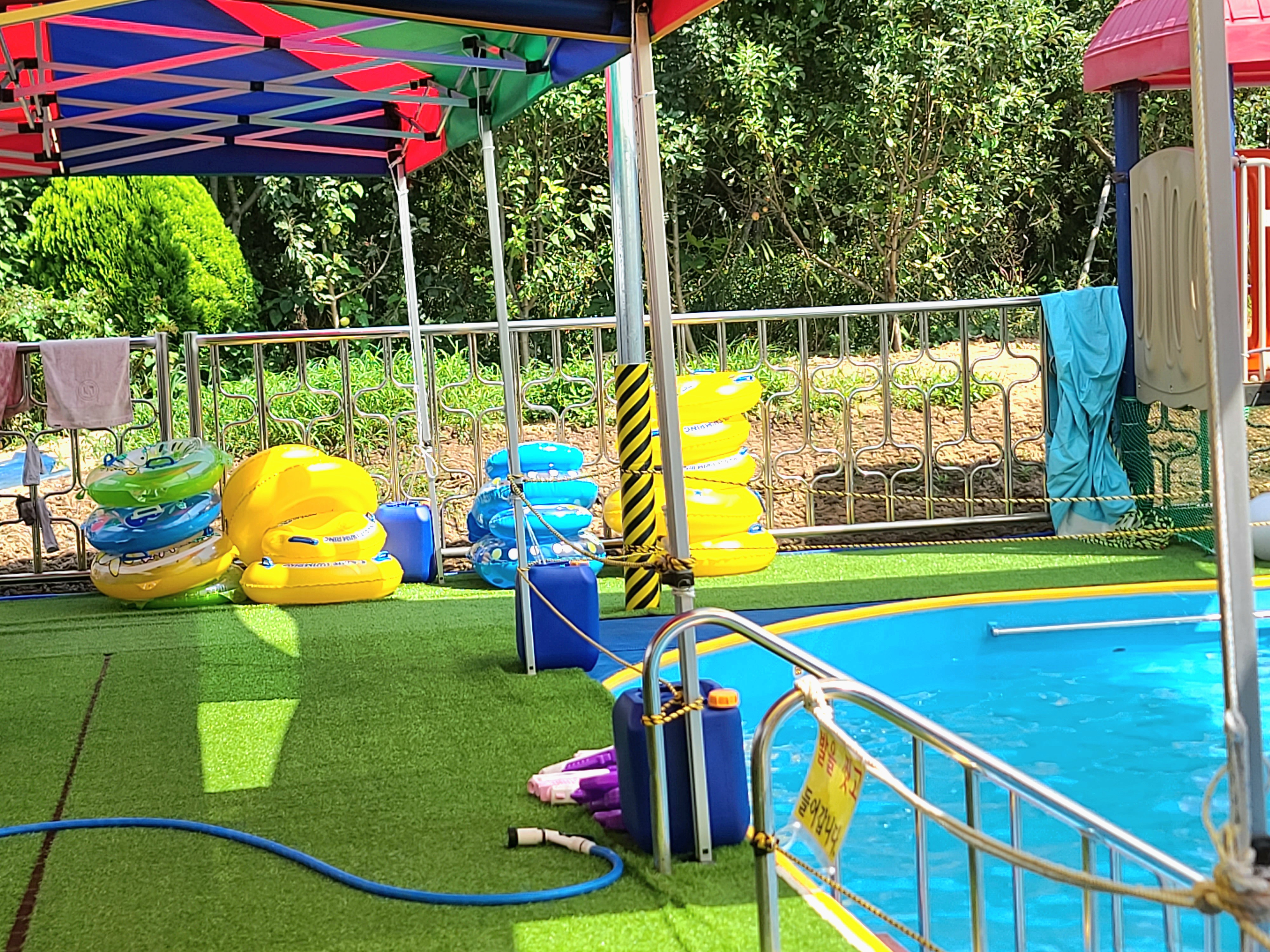 수영장은 크게 풀장 두개구요 하나는 60cm되구요 하나는 더 낮아요 미끄럼틀 두대있는데 물속으로 풍덩 들어갈수있어요! 이것도 간간히 계속 타더라고요