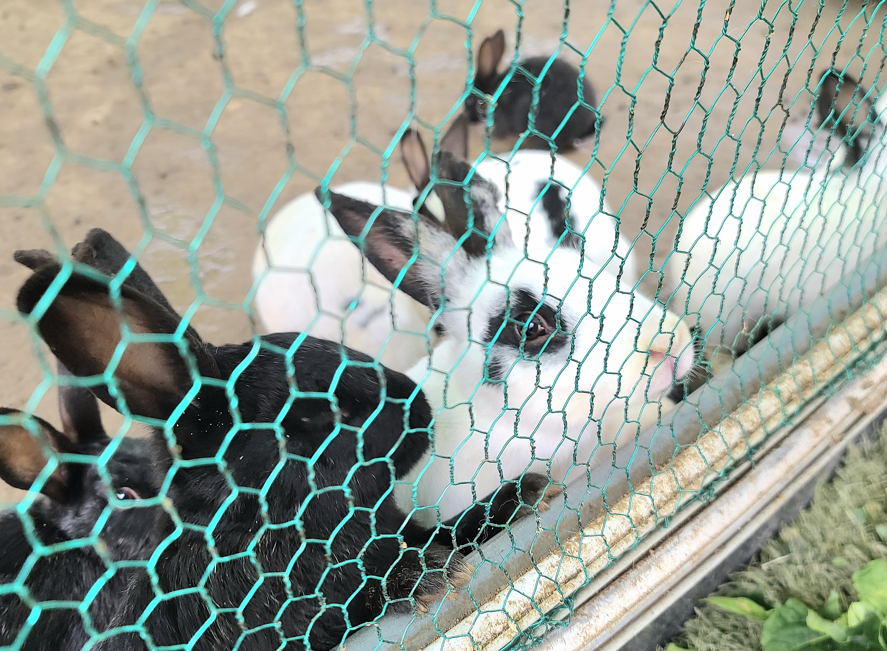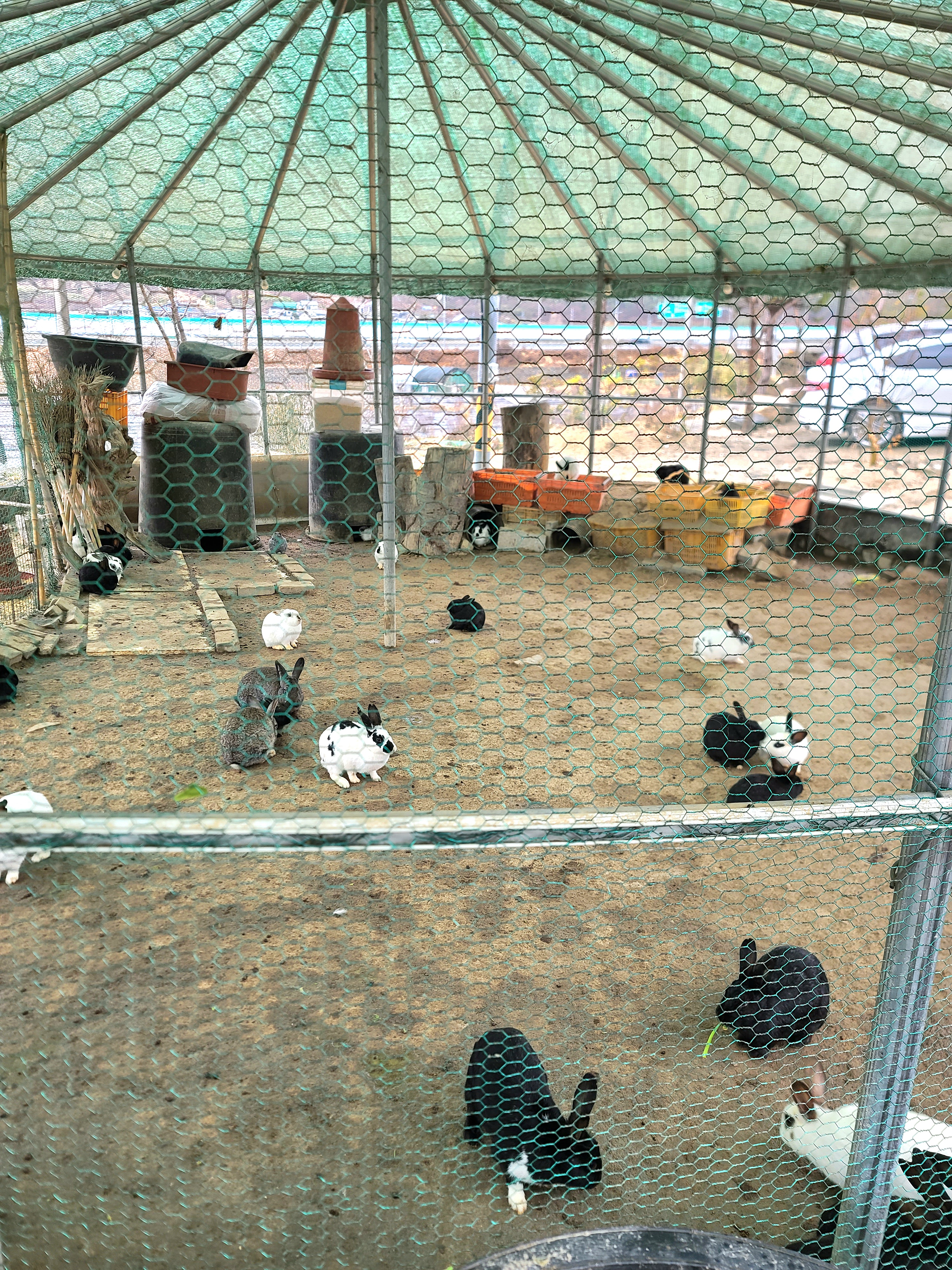 주차장 옆에 동그란 울타리에 토끼 닭이 있어요