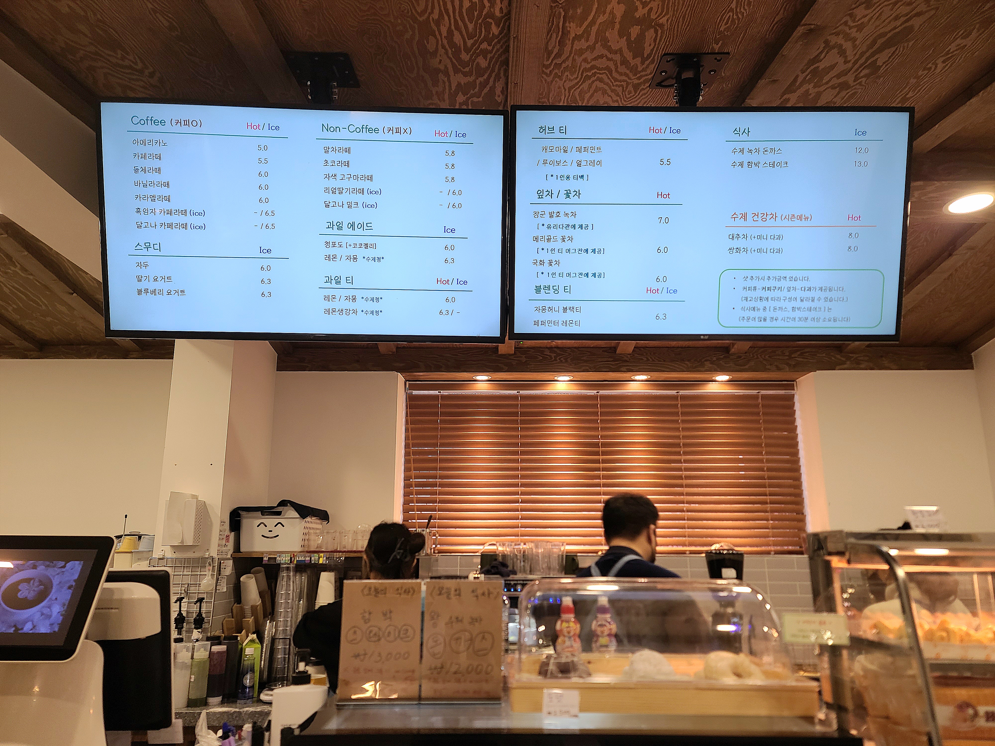 기본적으로 커피들도 있고 커피가 안들어간 에이드 꽃차 허브티들도 있더라고요 베이글이나 케이크도 팔고
