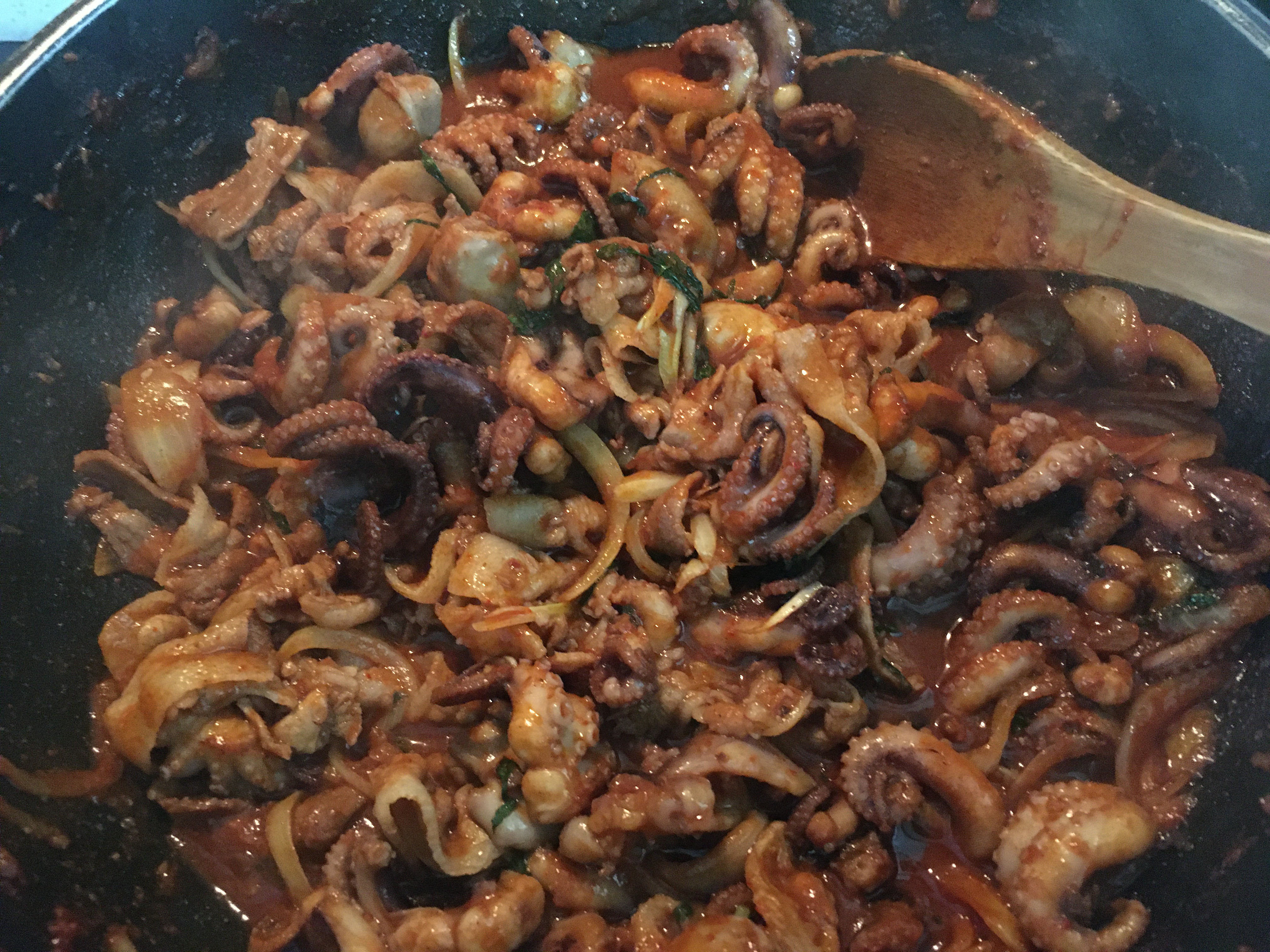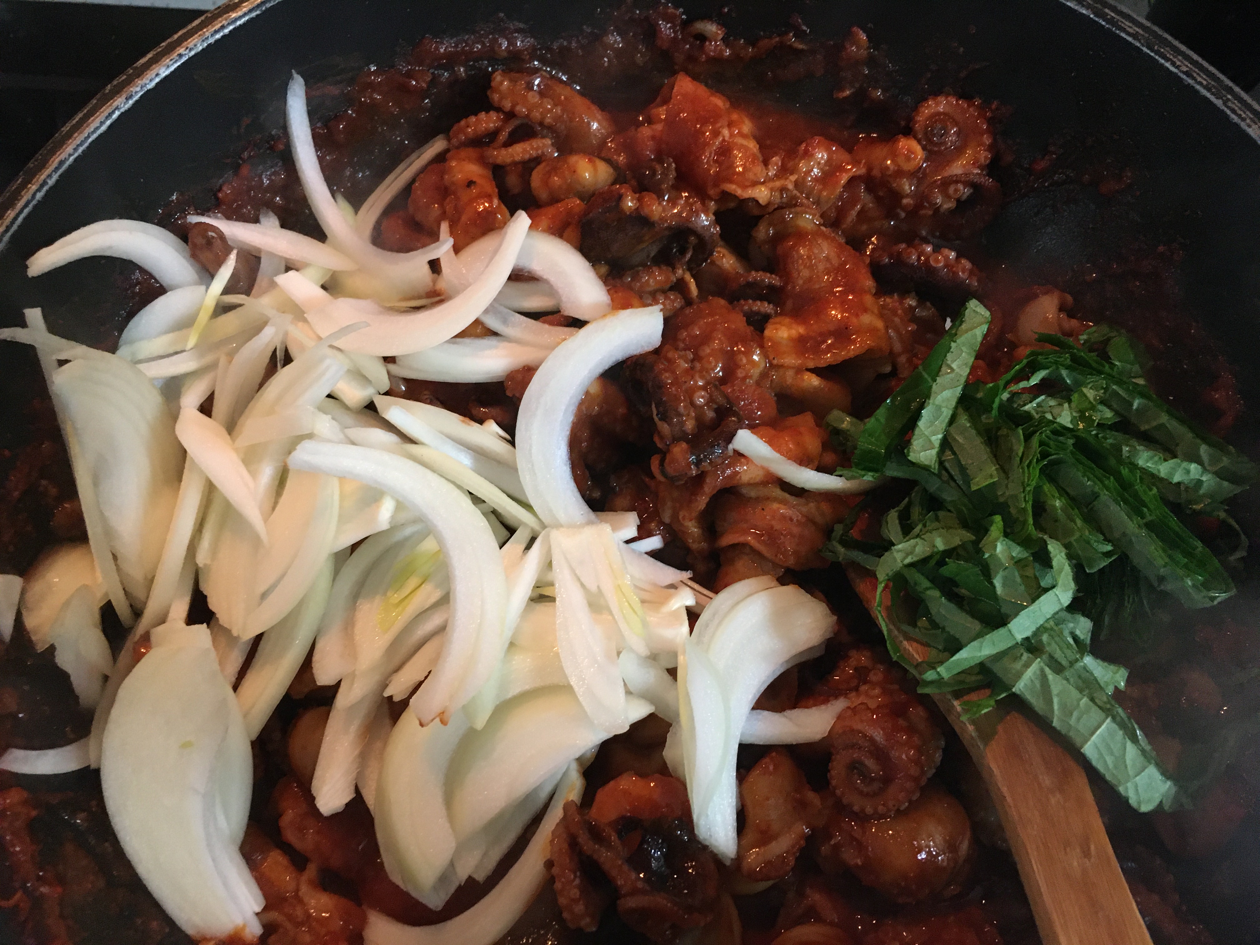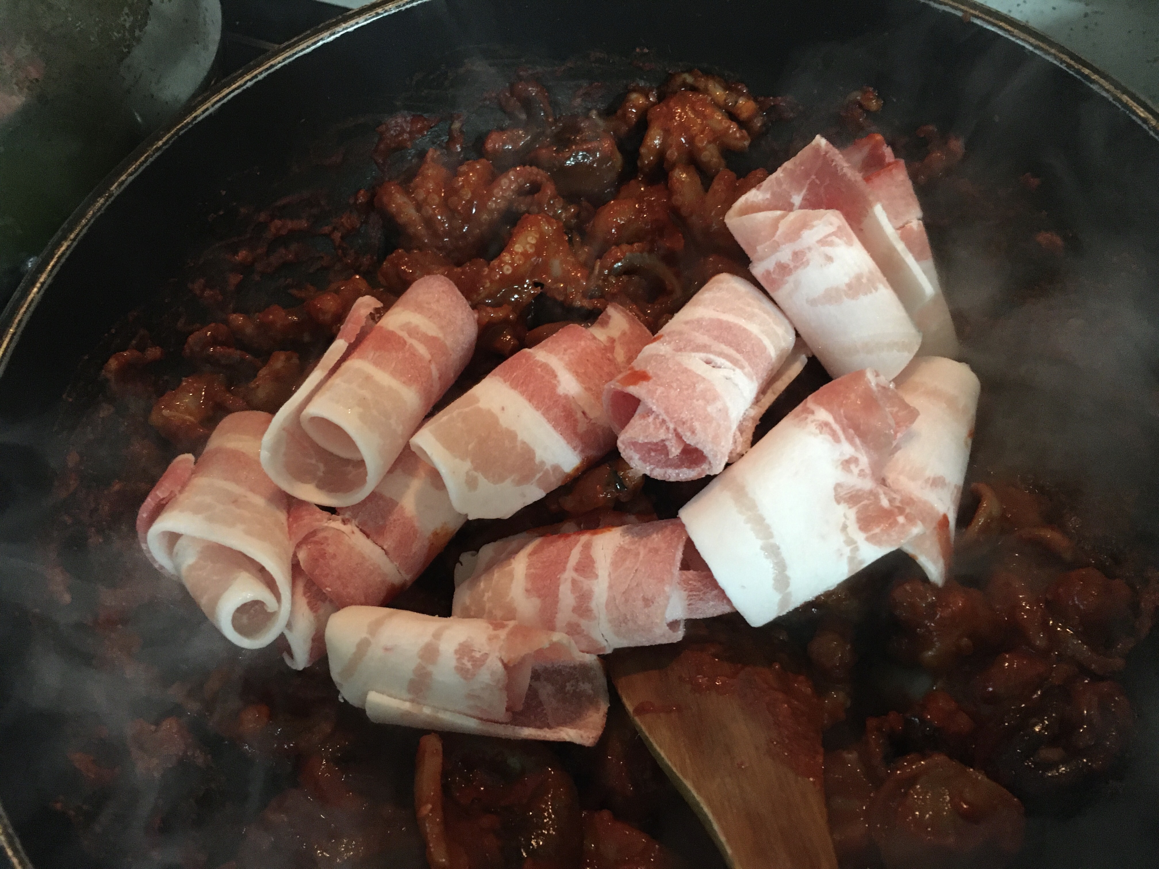 중불에 쭈꾸미를 볶다가 대패삼겹살 넣어주고 야채넣어주기